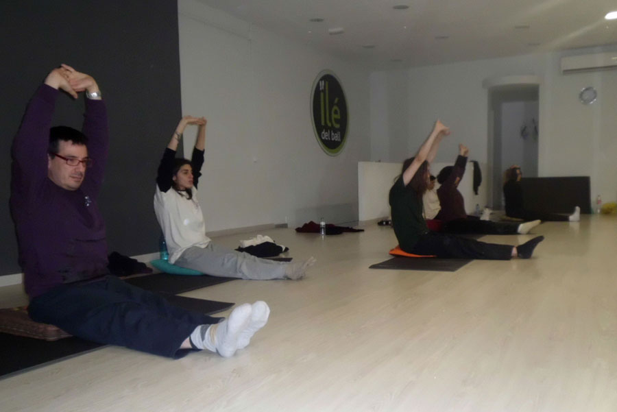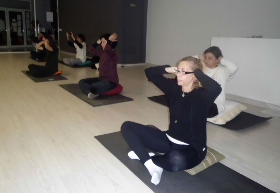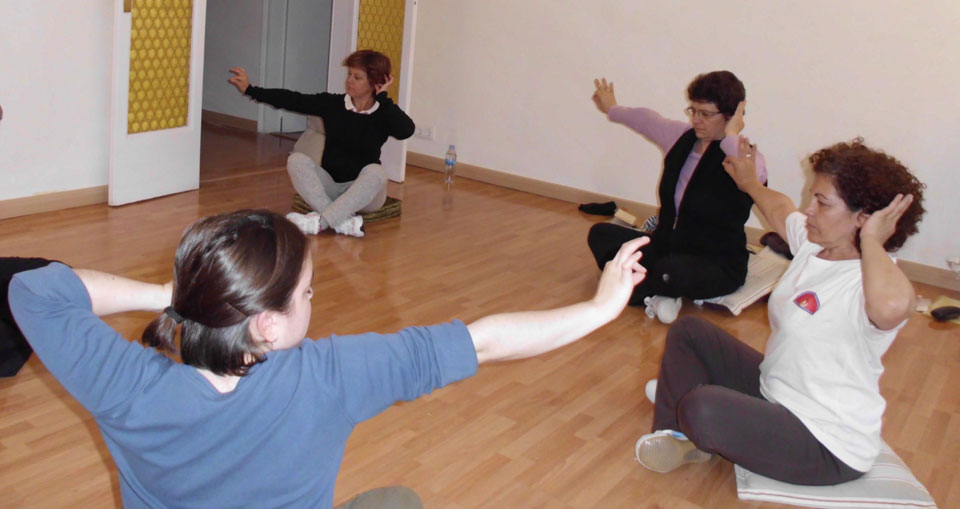 Practicando Shi Er Duan Jin o las 12 joyas sentados.