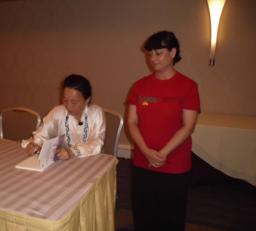 Maestra Wang Yu Lin. Profesora de la Universidad de Tsinghua, firmando libros tras su clase magistral de tecnificación del sistema Taiji Yang Sheng Zhang o Qigong con bastón |