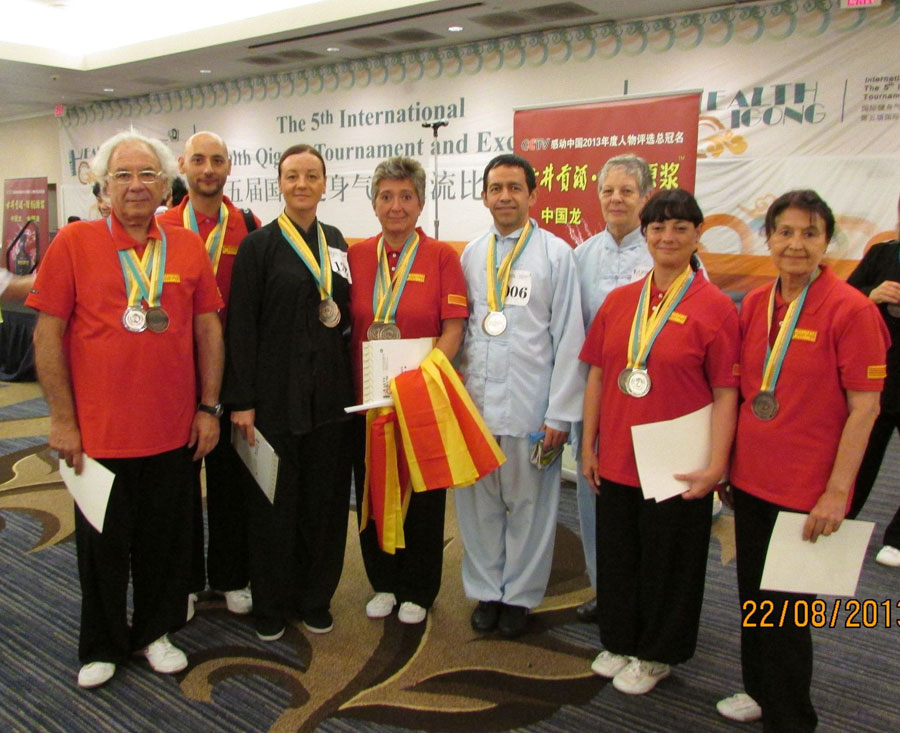 Integrantes del Instituto de Qigong de Barcelona junto a los representantes de las delegaciones: Serbian Qigong Association con Marta Koso y Health Qigong in Argentina con Mario Raul Atencco y Marta Susana Echaide, también ganadores y con los que surgió una buena amistad.